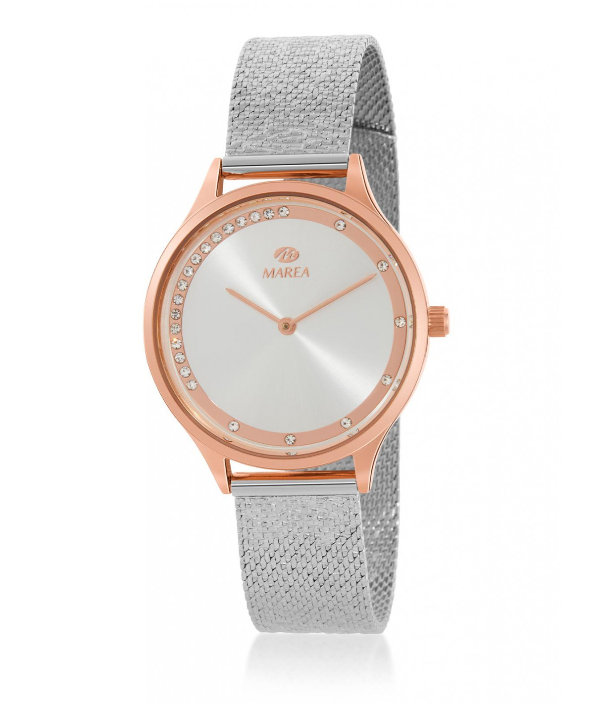 Reloj para mujer, analógico con caja en metal antialérgico rosé gold y esfera plateada con piedras blancas y agujas y detalles en color rosé gold.