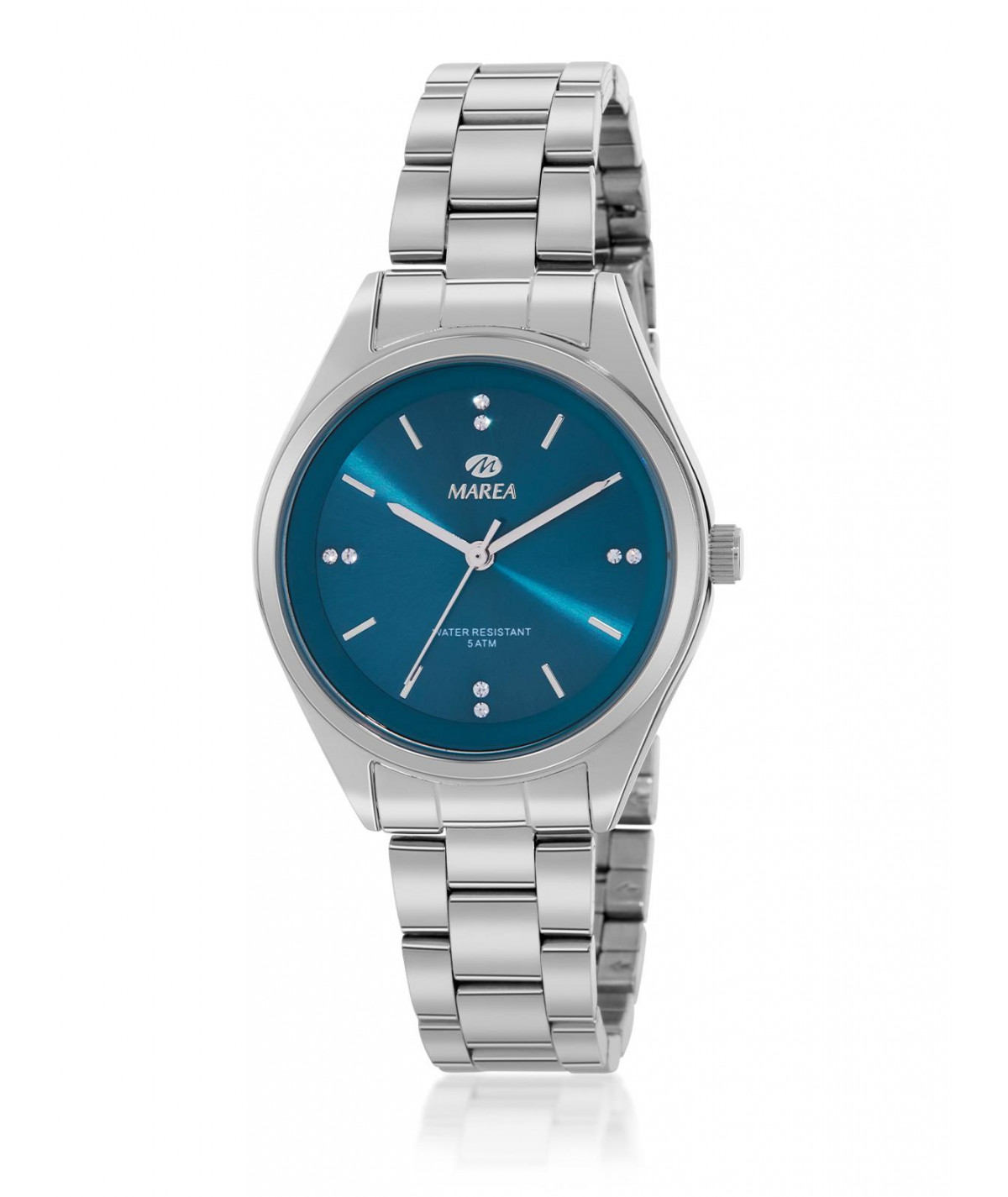 Reloj para mujer, analógico con caja de acero color plata y esfera color turquesa oscuro con pedrería en índices.