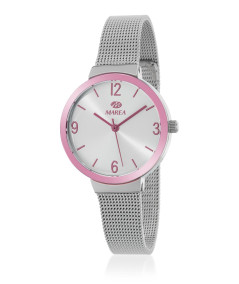 Reloj para mujer, analógico con caja en metal antialérgico color plata y esfera color plateado con agujas e índices en color rosa claro a juego con su bisel