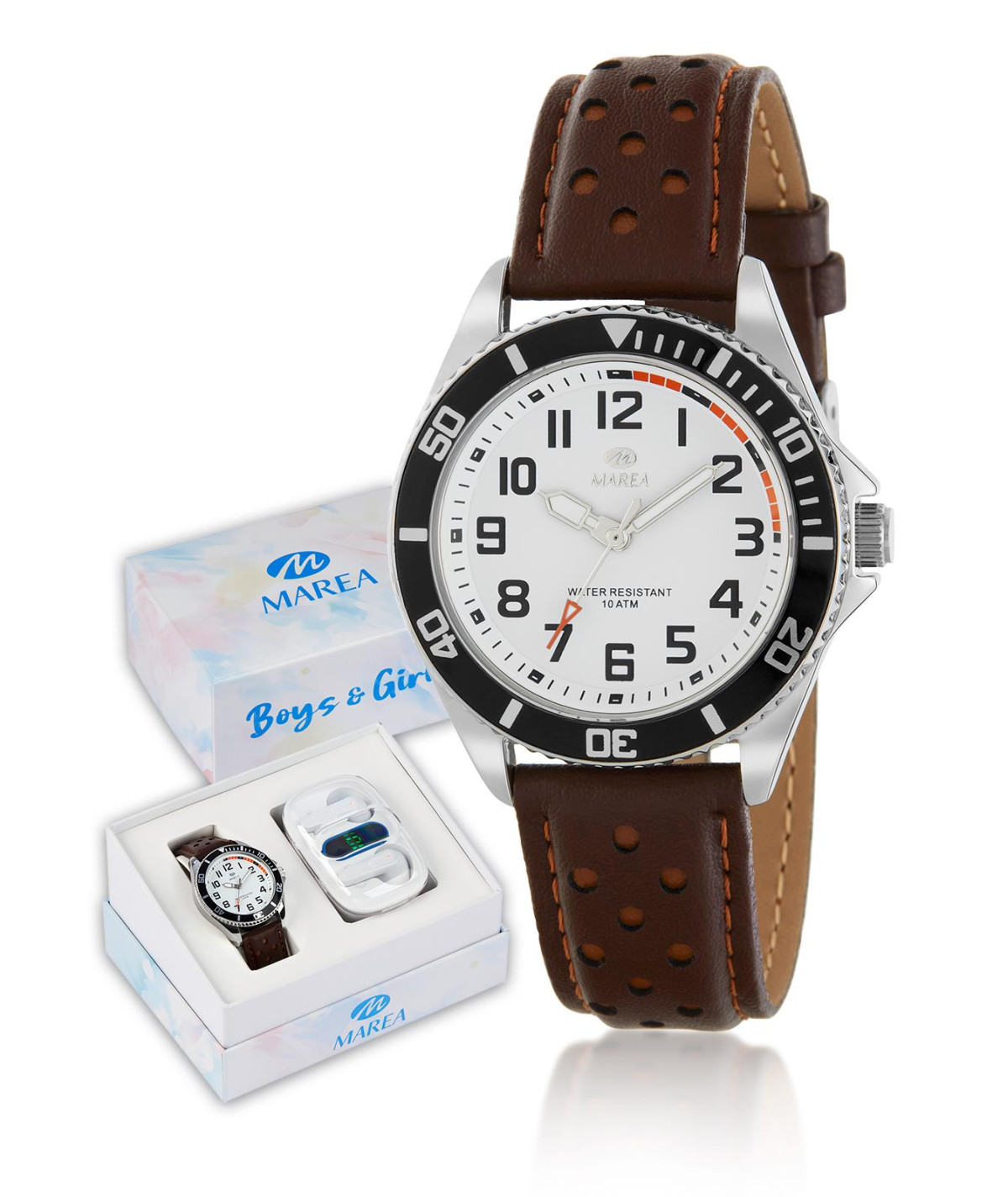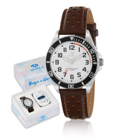 Reloj para niño, Especial Comunión, con caja de acero y correa de piel color marrón oscuro con detalles en color marrón claro.