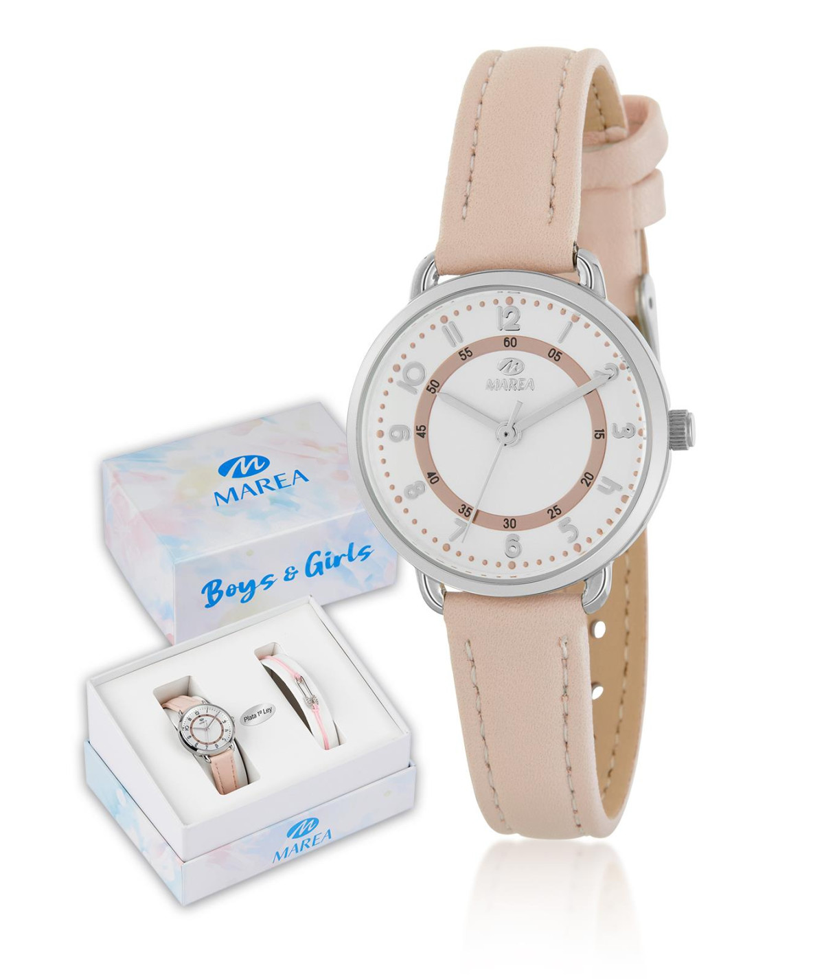 Reloj para niña, Especial Comunión, analógico con correa de piel color nude con pespunte en color blanco