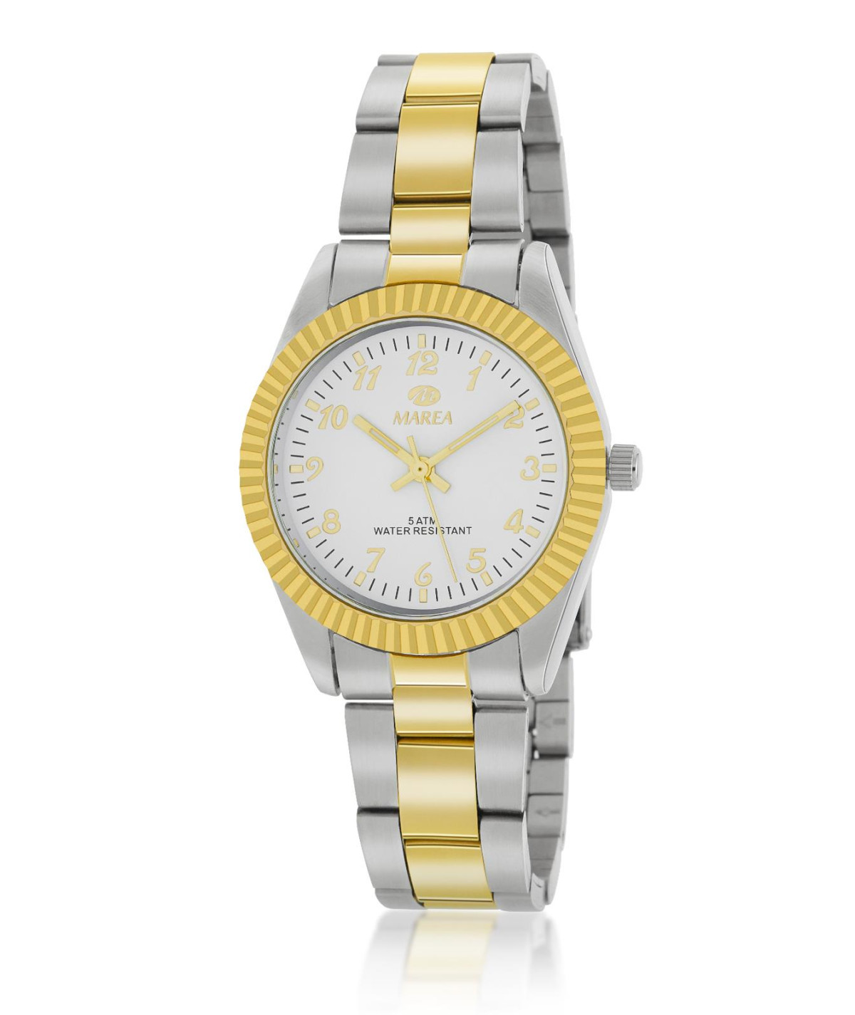 Reloj para mujer, analógicoco con caja de metal antialérgico color plata y bisel dorado. Esfera blanca con úmeros dorados
