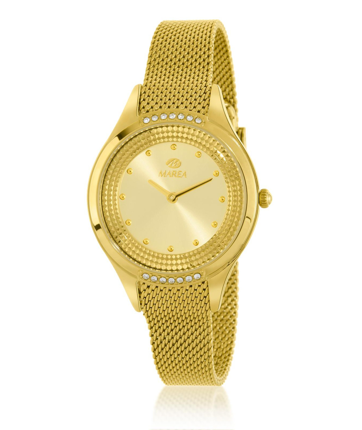 Reloj para mujer, analógico con caja de metal color doradocon pedrería en bisel y tapa trasera y corona de acero.