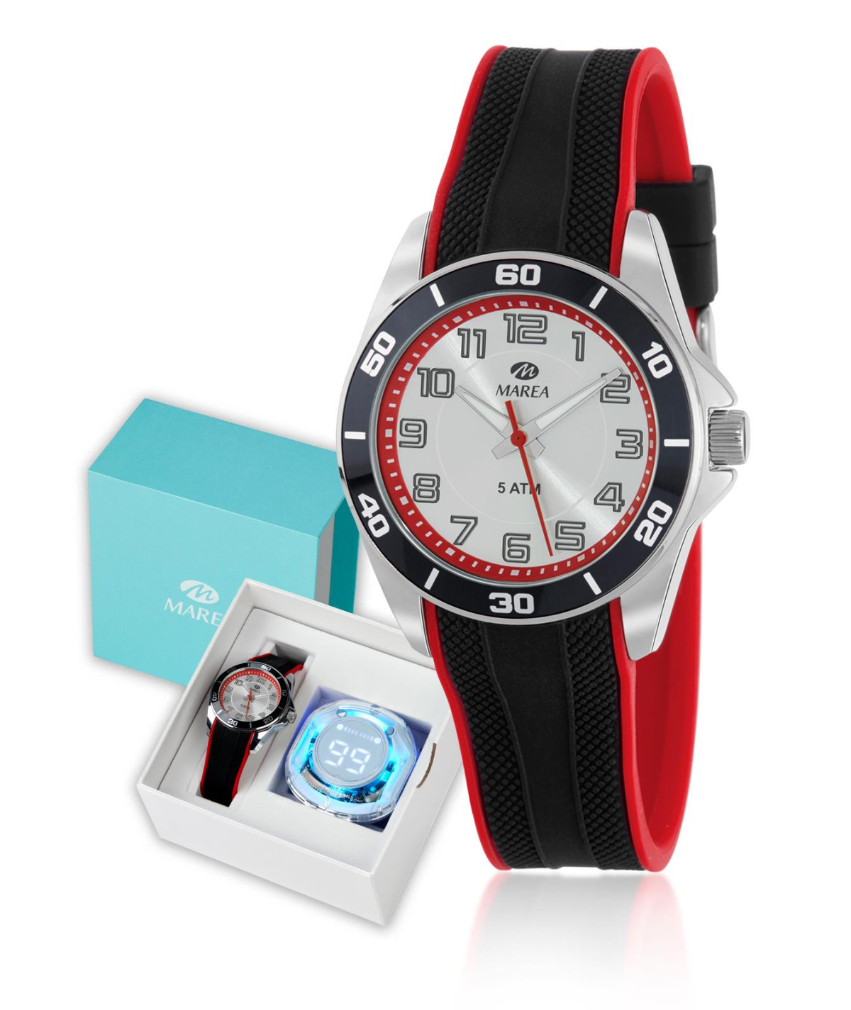 Reloj para niño, Especial Comunión, analógico con esfera blanca y correa de caucho negro con detalles rojos