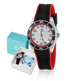 Reloj para niño, Especial Comunión, analógico con caja de resina plateada, bisel negro y esfera blanca con detalles rojos