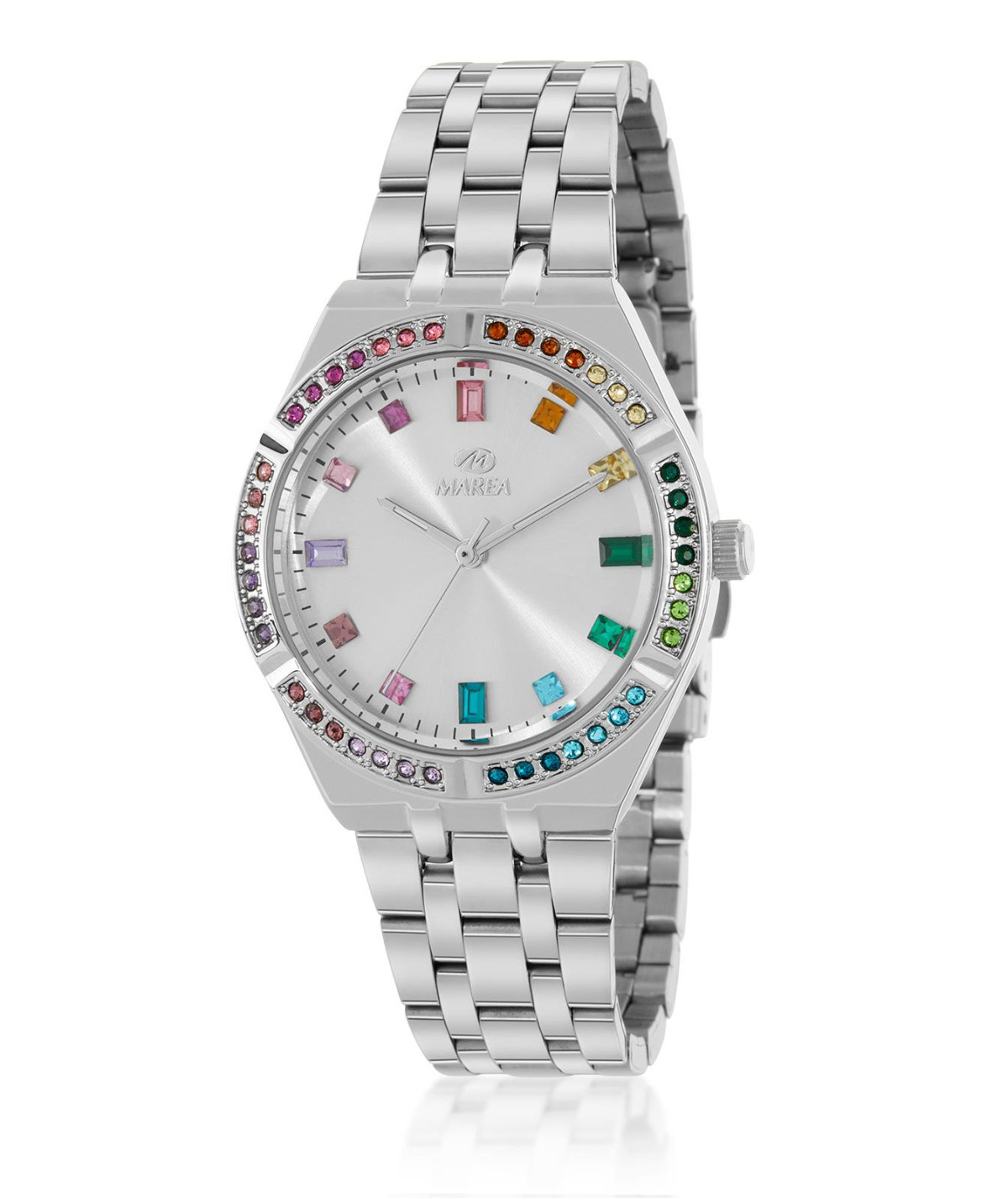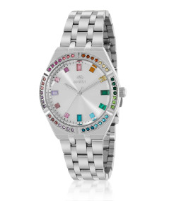 Reloj para mujer, analógico con caja de metal antialérgico color plata con pedrería arco iris en bisel, esfera color plateado con índices de pedrería arco iris.