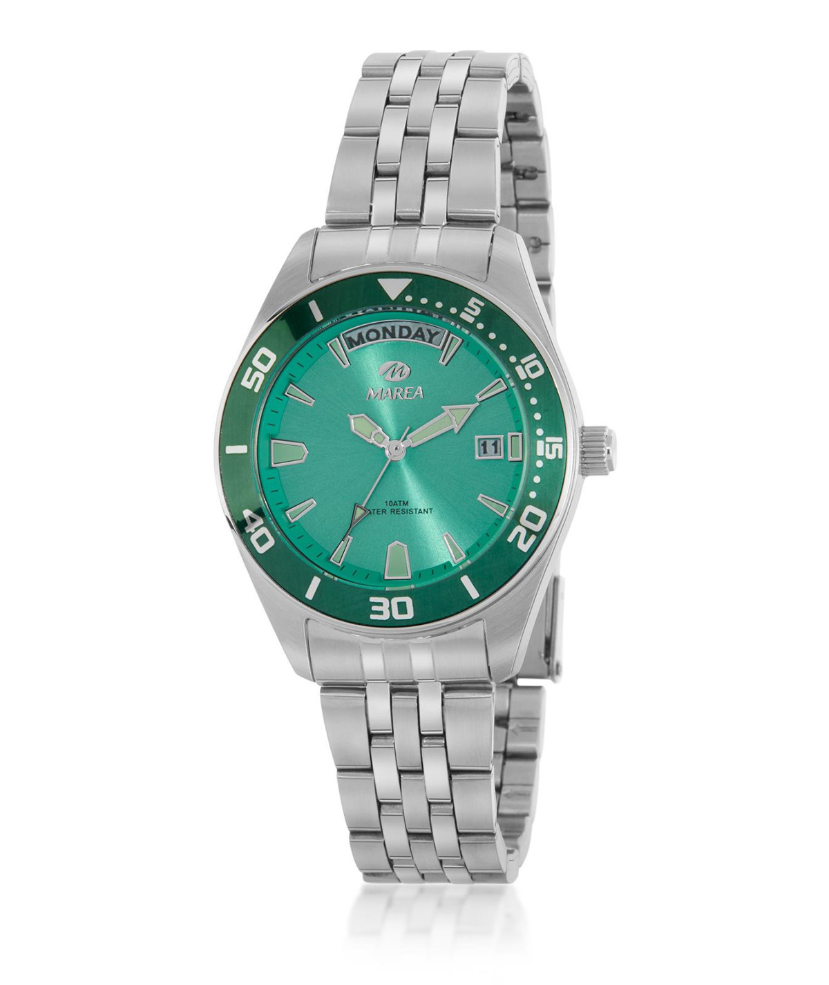 Reloj para mujer, analógico con caja de acero color plata y esfera verde con calendario, dia de la semana y bisel rotulado