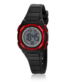 Reloj infantil, digital con caja de plástico color negro con detalles color rojo y tapa trasera de acero.