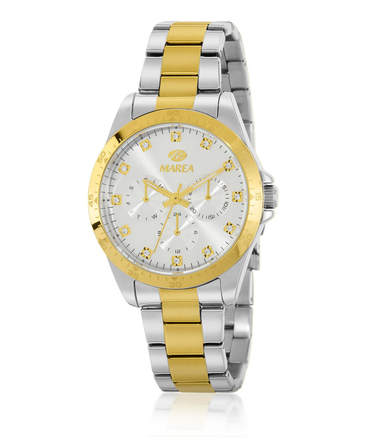 Reloj para mujer, analógico con caja de metal antialérgico color plata con bisel chapado en oro, con tapa trasera y corona de acero.