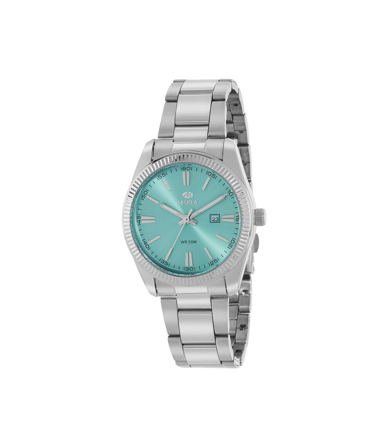 Reloj para mujer, analógico con caja de metal antialérgico color plata y esfera turquesa con calendario