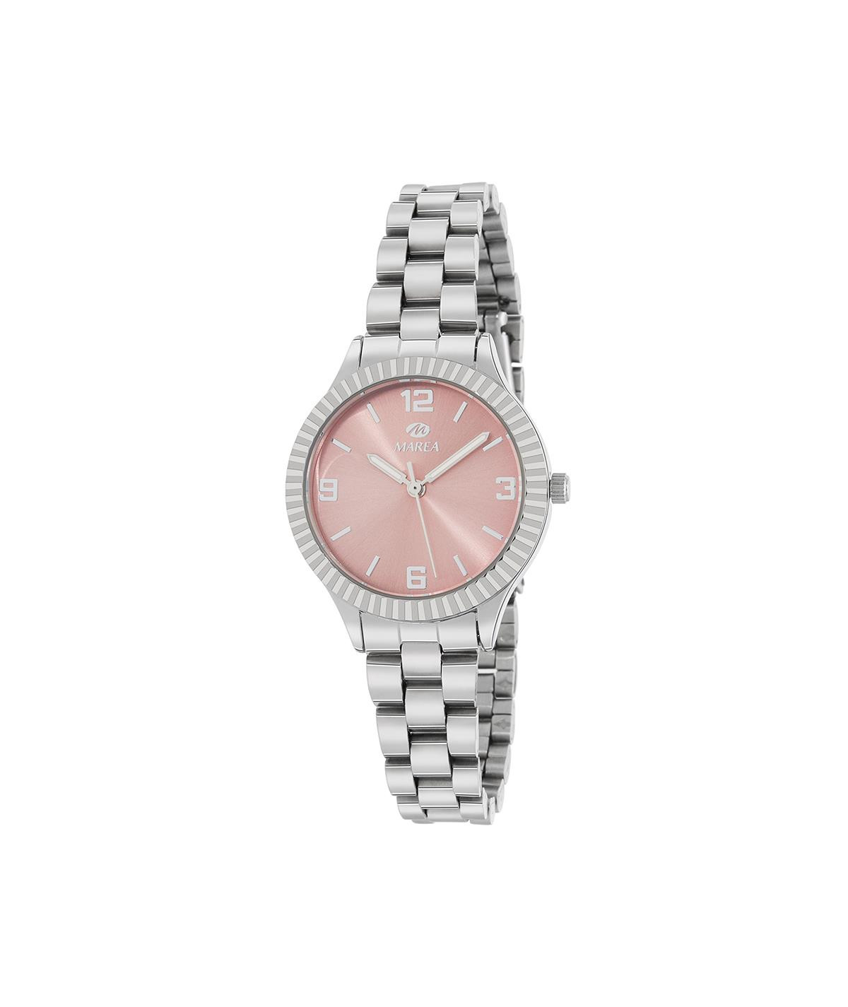 Reloj para mujer, analógico con caja en metal antialérgico color plata y esfera rosa con bisel estriado.