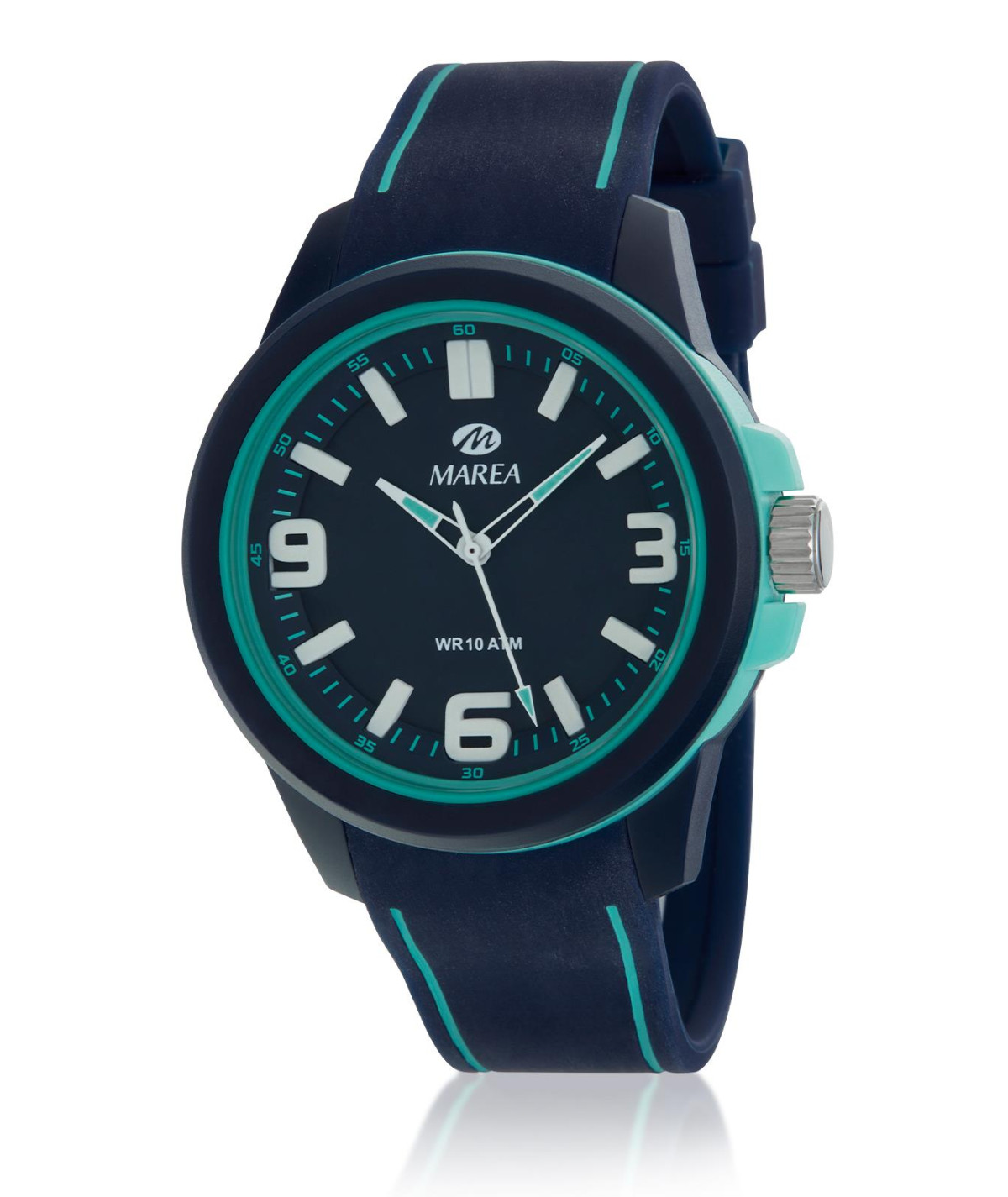 Reloj para hombre, analógico con caja de plástico color azul con detalles turquesa y esfera azul oscuro