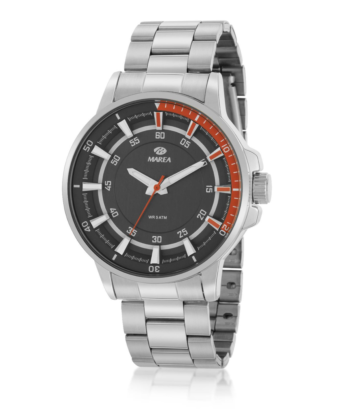 Reloj para hombre, analógico con caja de metal antialérgico color plata y esfera gris oscuro con detalles y segundero en color naranja.
