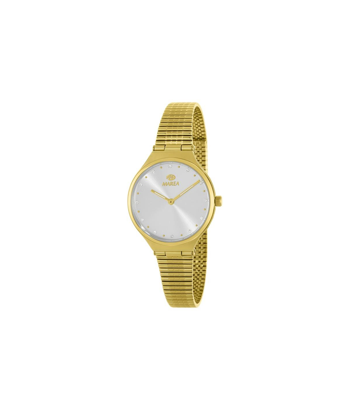 Reloj para mujer, analógico con caja de acero color dorado y esfera plateada con índices de circonitas