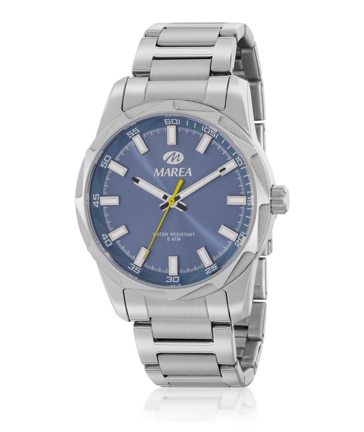 Reloj para hombre, analógico con caja de metal antialérgico color plata y esfera azul claro con segundero en color amarillo