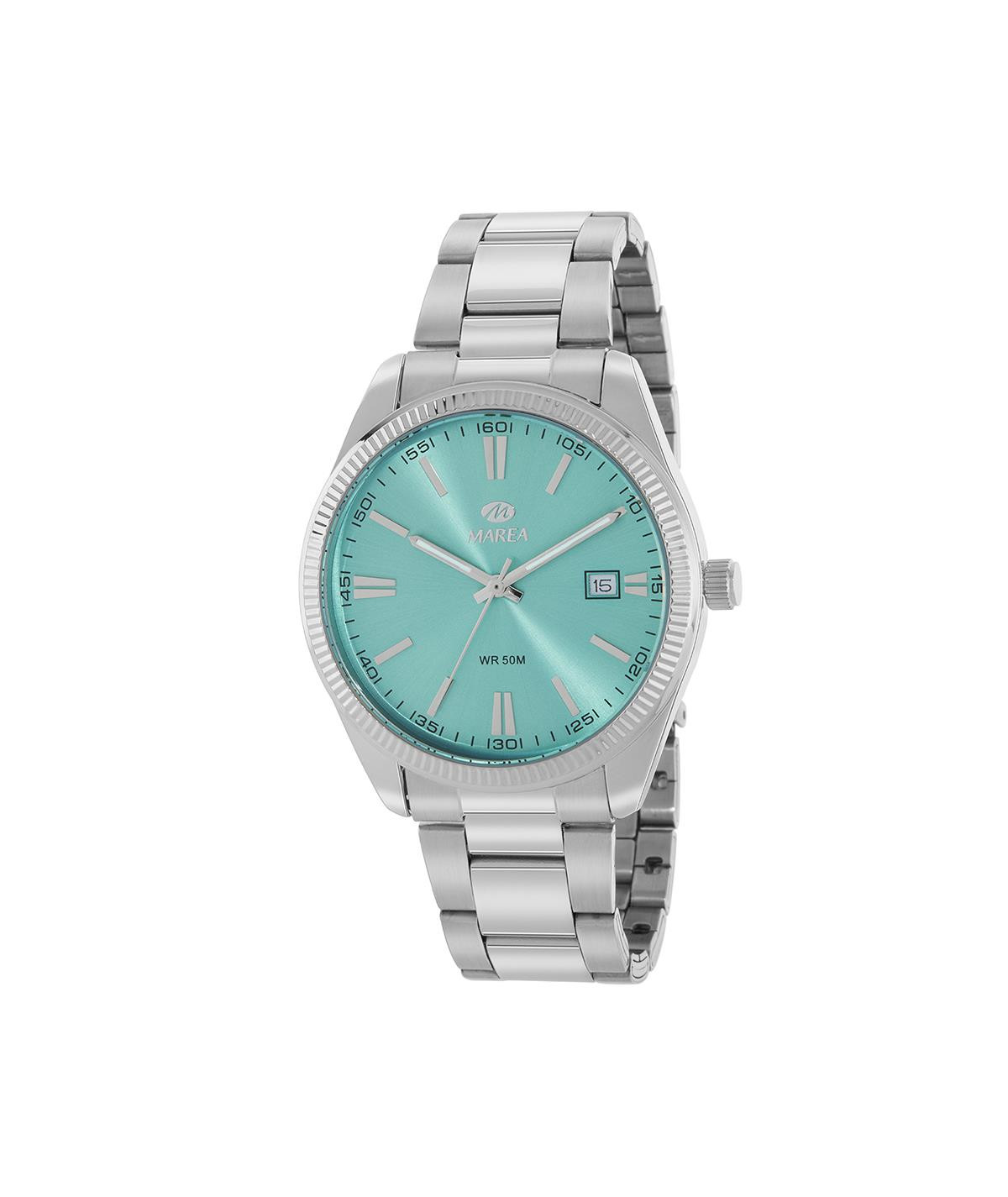 Reloj para hombre, analógico con caja de metal antialérgico color plata y esfera turquesas con calendario