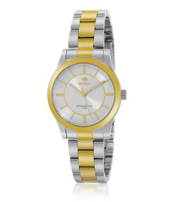 Reloj para mujer, analógico con caja de acero color plata, bisel color dorado y esfera plateada con índices y agujas en color dorado.