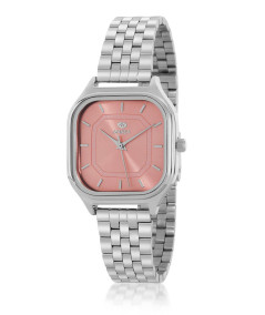 Reloj para mujer, analógico con caja de metal antialérgico color plata y esfera rosa claro con índices y agujas color plata