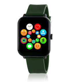 Smartwach unisex con caja cuadrada color negro y correa de silicona color verde oscuro