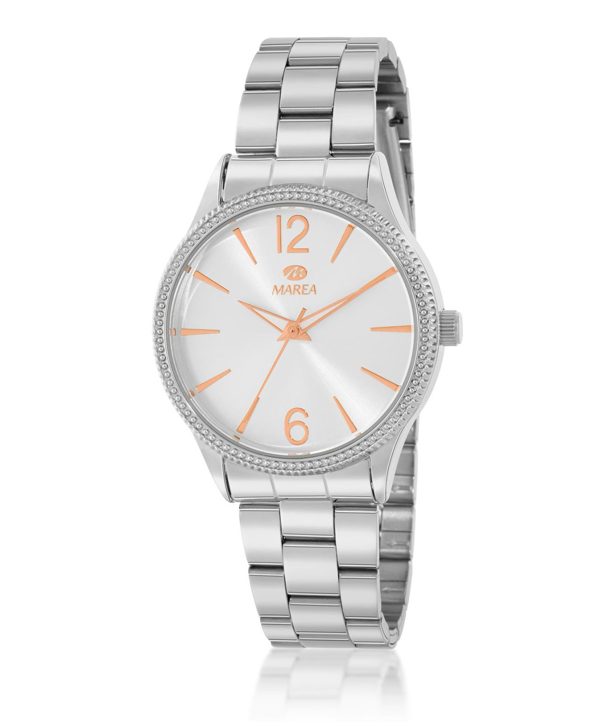 Reloj para mujer, analógico con caja de metal antialérgico color plata y esfera blanca con índices rosé gold