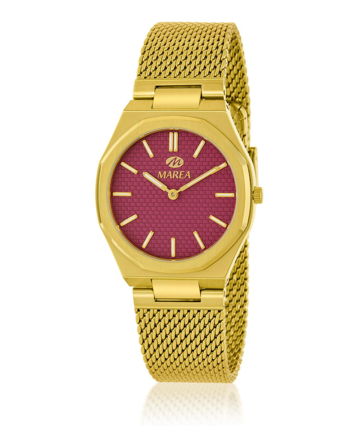 Reloj para mujer, analógico con caja de acero color dorado y esfera granate