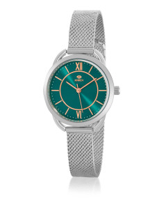 Reloj para mujer, analógico con caja de metal antialérgico color plata y esfera color verde con índices y agujas de color rose gold.