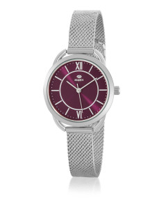 Reloj para mujer, analógico con caja de metal antialérgico color plata y esfera color morado con índices y agujas de color rose gold.