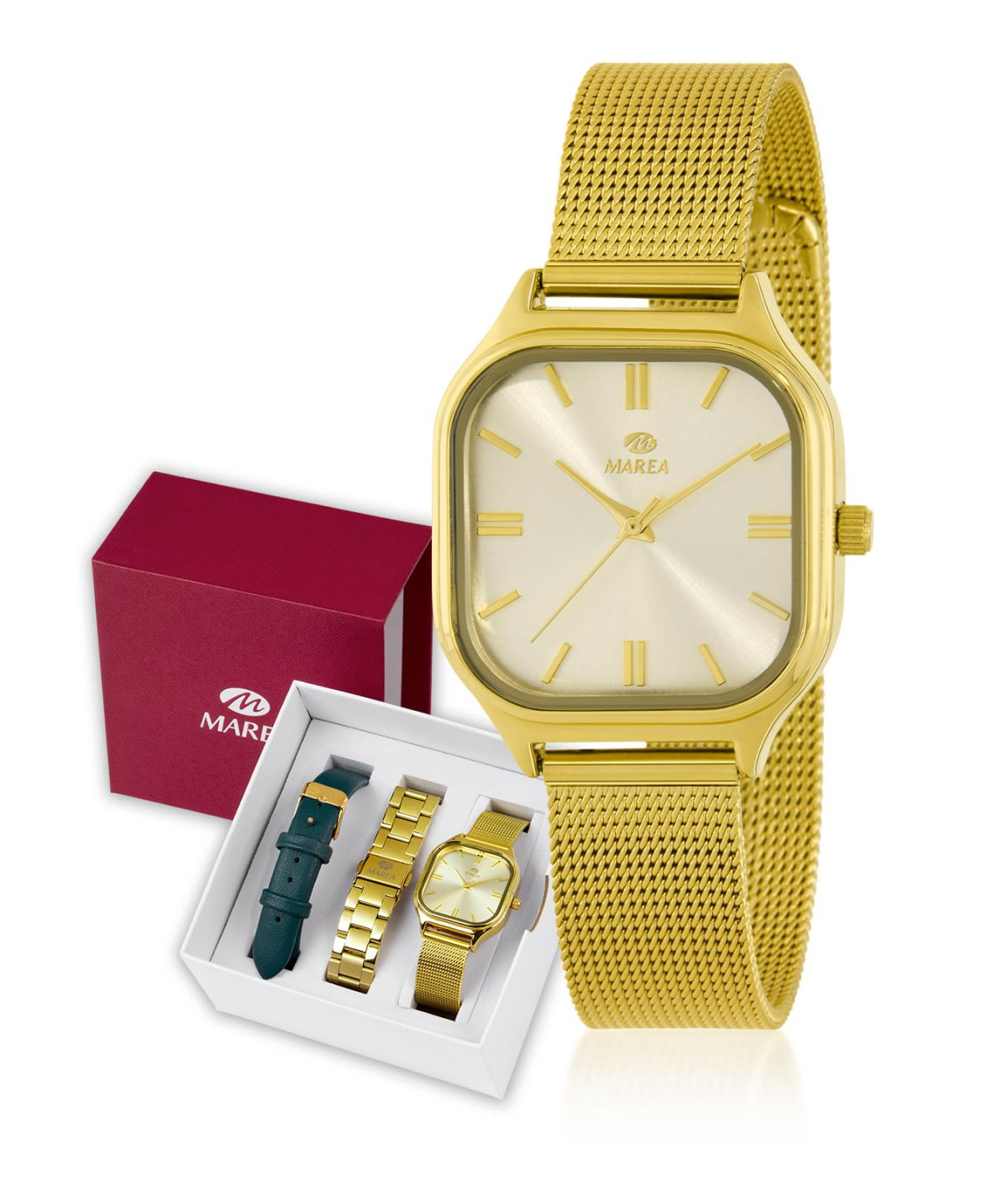 Reloj para mujer, analógico con correas de cuero verde, malla milanesa y armis dorado