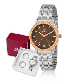 Reloj para mujer, analógico con caja de metal antialérgico color plata y biseles liso, con circonitas y facetado. Esfera color color marrón con índices de color rose gold.