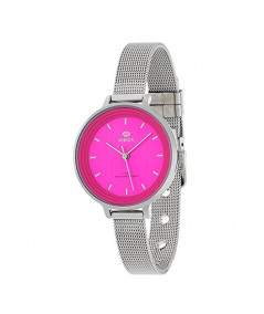Reloj para mujer, analógico con caja en metal antialérgico color plata y esfera fucsia. La correa es de acero tipo malla milanesa, ajustable fácilmente a la medida deseada.