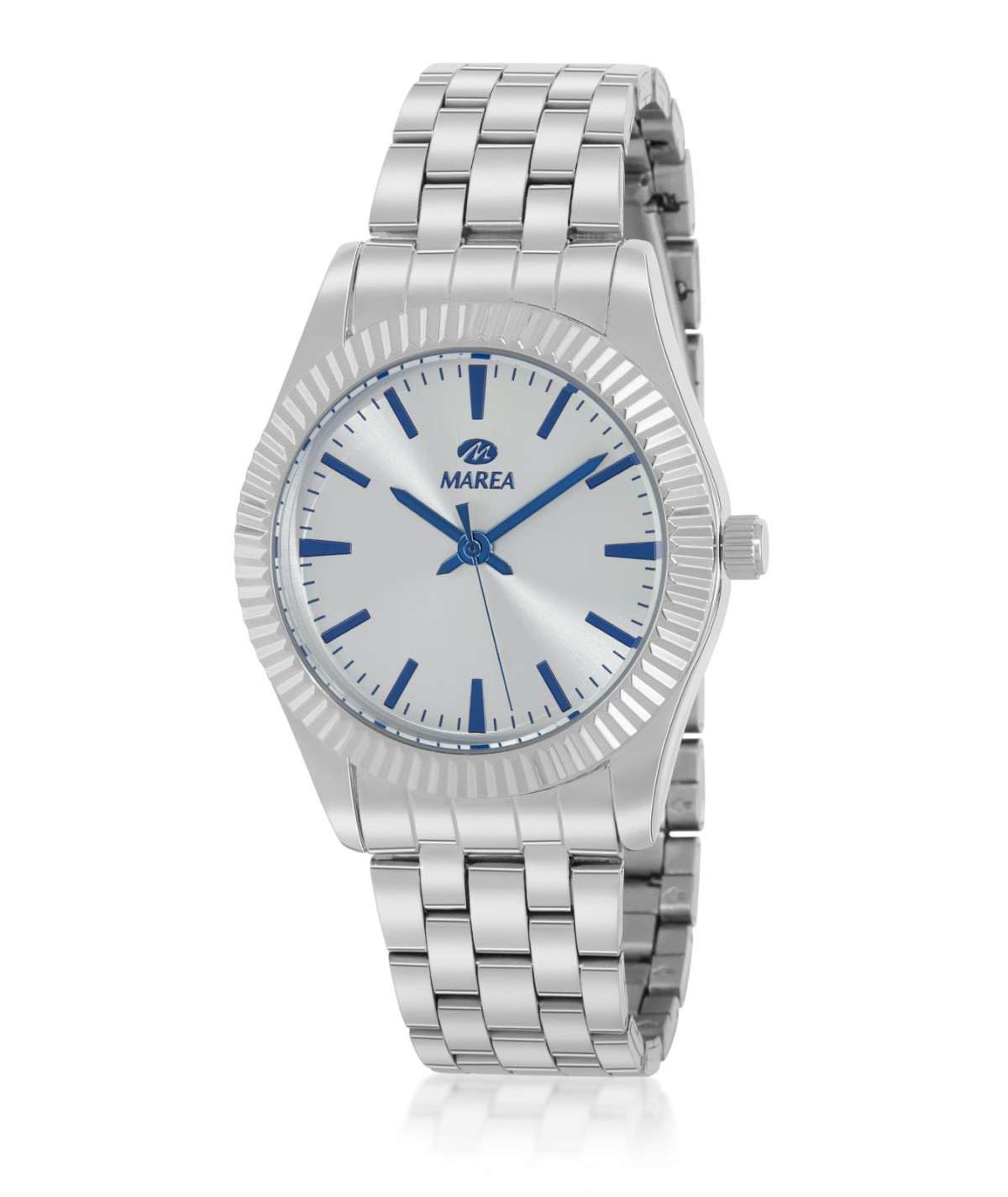 Reloj para mujer, analógico con caja de metal antialérgico color plata y esfera plateada con índices y agujas en tono azul