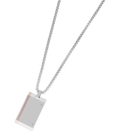 Collar de acero con placa rectangular y detalle de líneas verticales en color cobre.