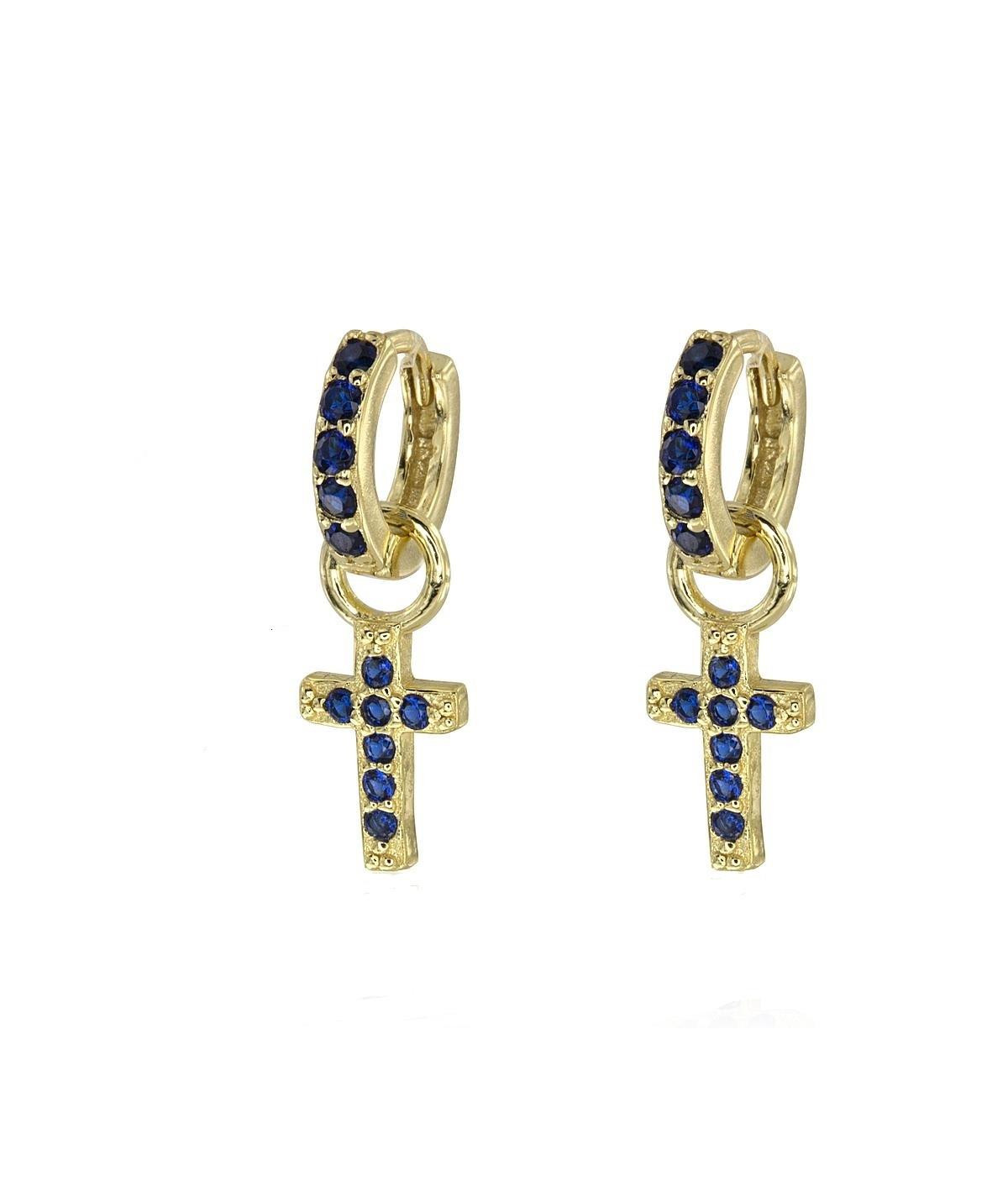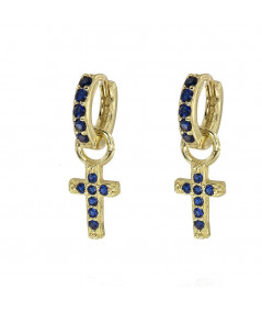 Súmate a la tendencia con estos aritos en plata de primera ley con baño en oro y cruz con piedrecitas de color azul, querdarán genial si los combinas con otros pendientes, piercing o ear cuff de nuestra colección