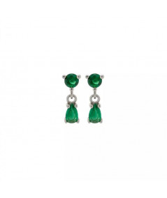 Unos pendientes de plata de ley rodiados con dos circonitas verde esmeralda una de ellas colgante.