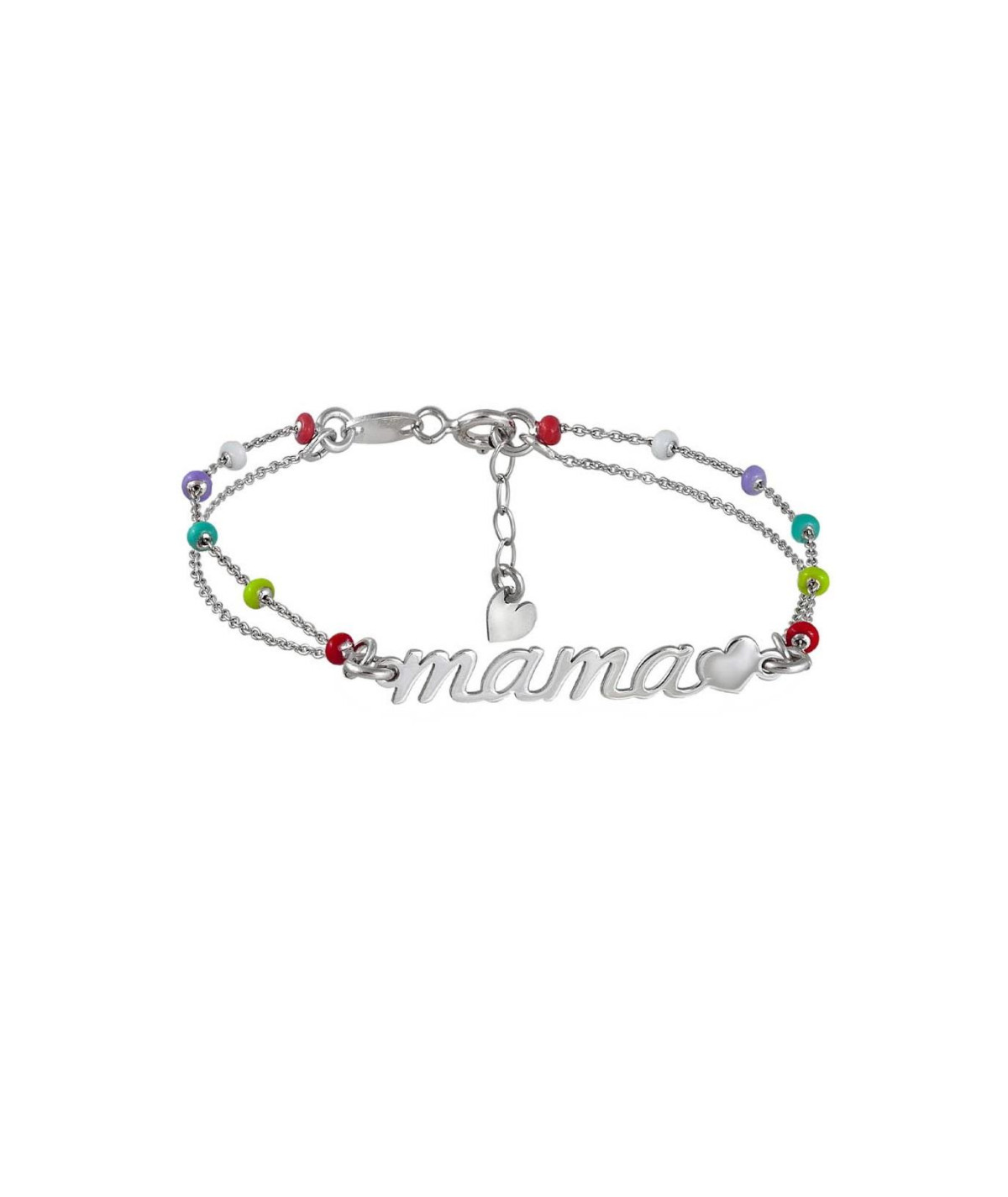 Una pulsera especial para regalar a la persona más importante para ti, Tu Mamá, es de plata de ley con detalle central de "mamá ♥" y cadena doble con bolitas de colores, un modelo versátil que se adaptará a culaquier estilo y look y que lucirá super orgullosa