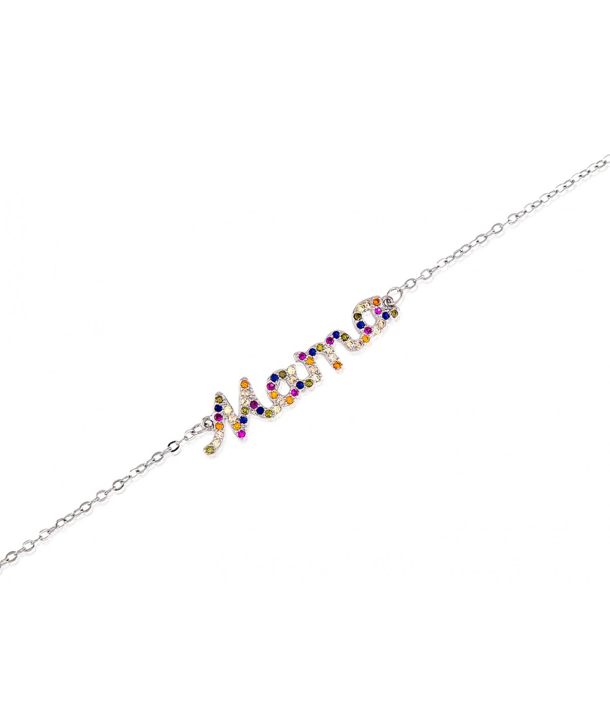 Bonito detalle para mamá, porque ella se lo merece todo, se trata de una pulsera en plata de primera ley con la palabra mamá con circonitas de colores, también tienes disponible el collar a juego.