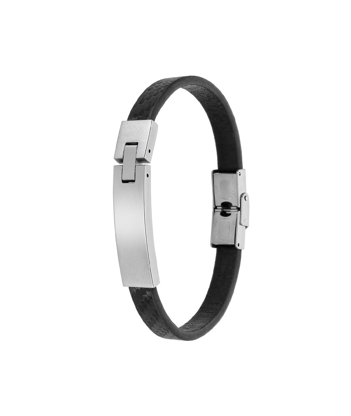 Pulsera para hombre de piel color negro con detalle central de placa personalizable donde podrás grabar un nombre, una fecha o palabra significativa para vosotros, por su carácter versátil le combinará perfectamente con cualquier out fit que decida llevar ya sea urbano y casual o más elegante