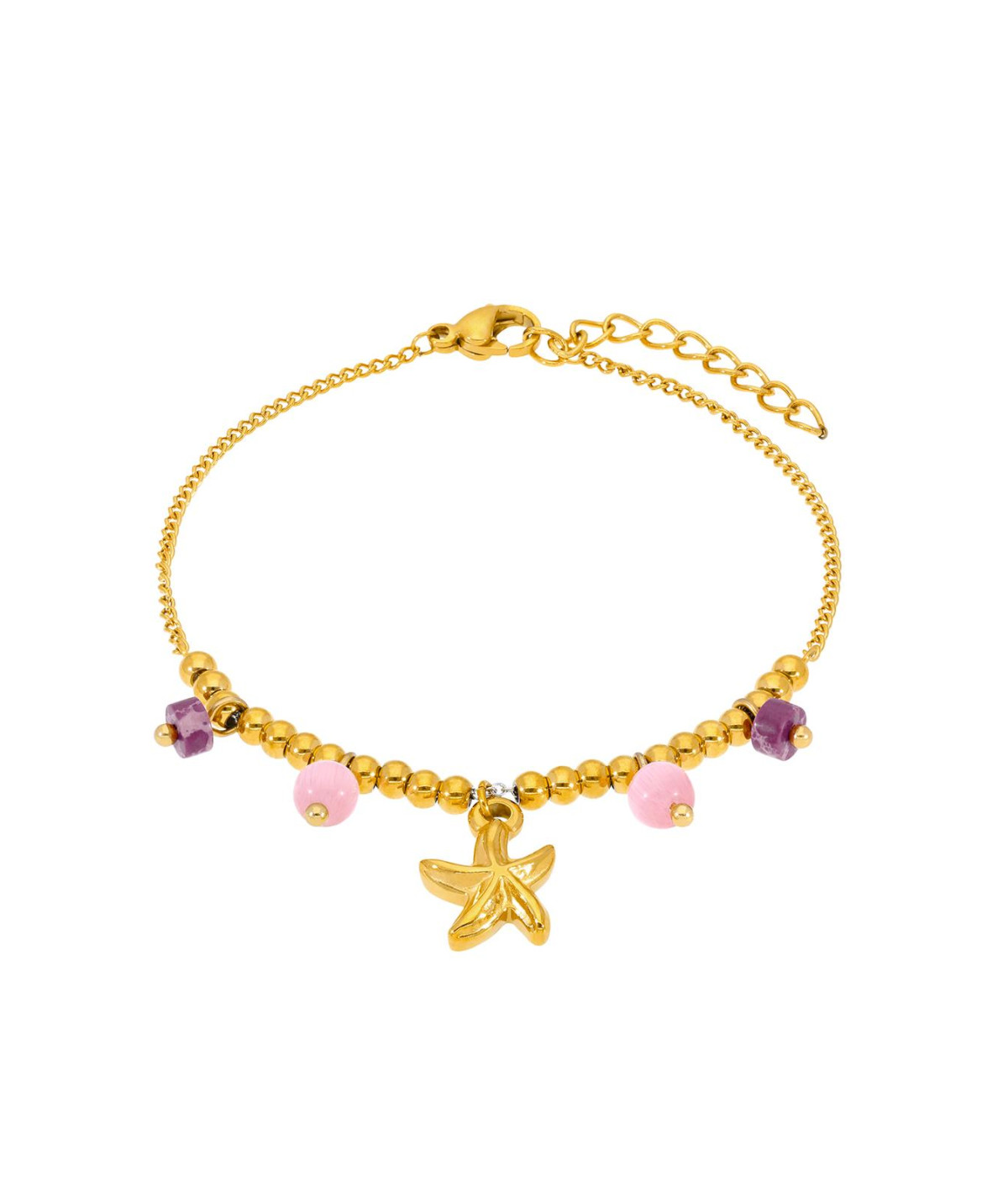 Pulsera de acero color dorada con piedras color rosa y colgante de estrella de mar.