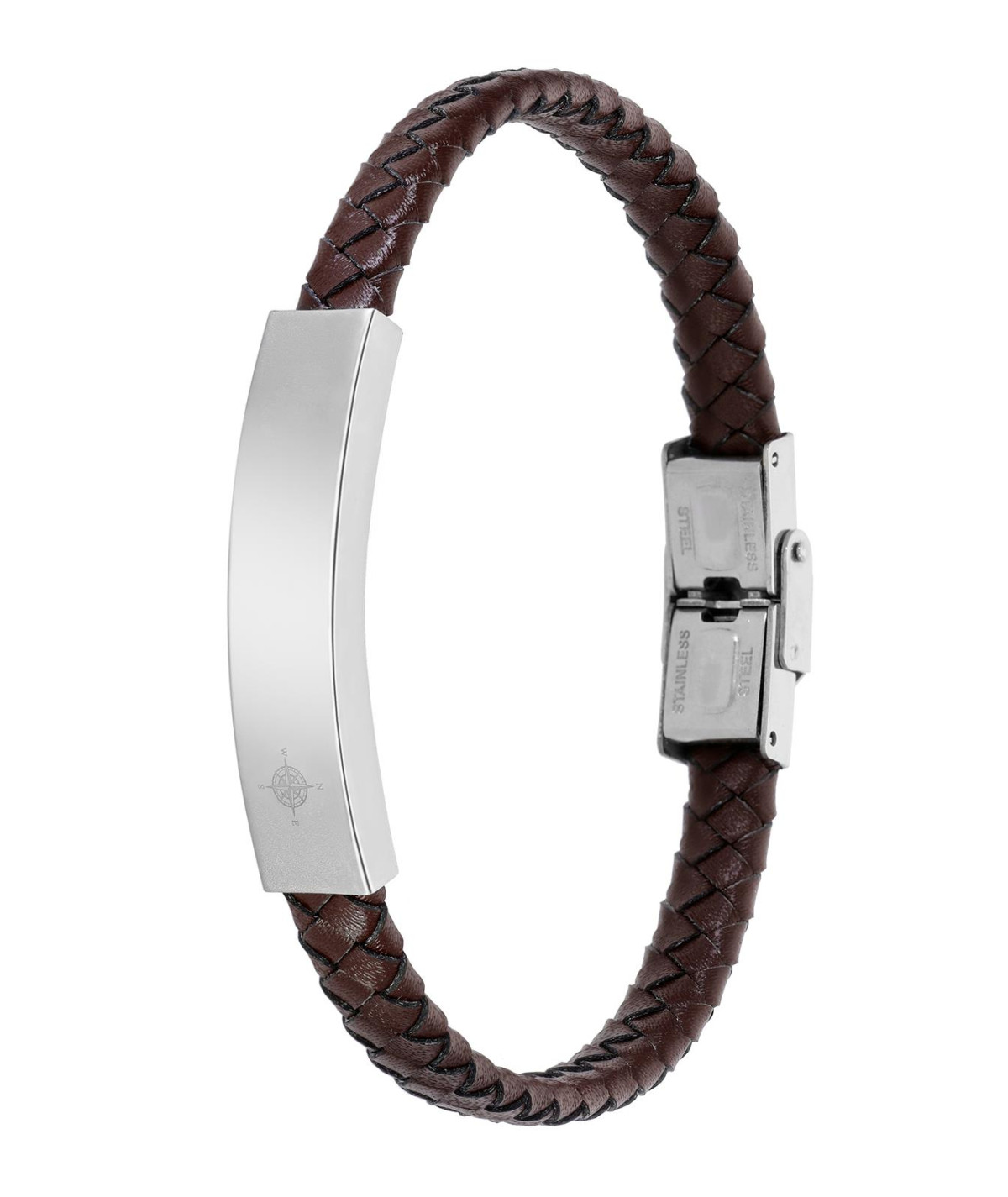 Pulsera de piel trenzada y placa de acero brillante con icono de rosa de los vientos grabado en un lado.