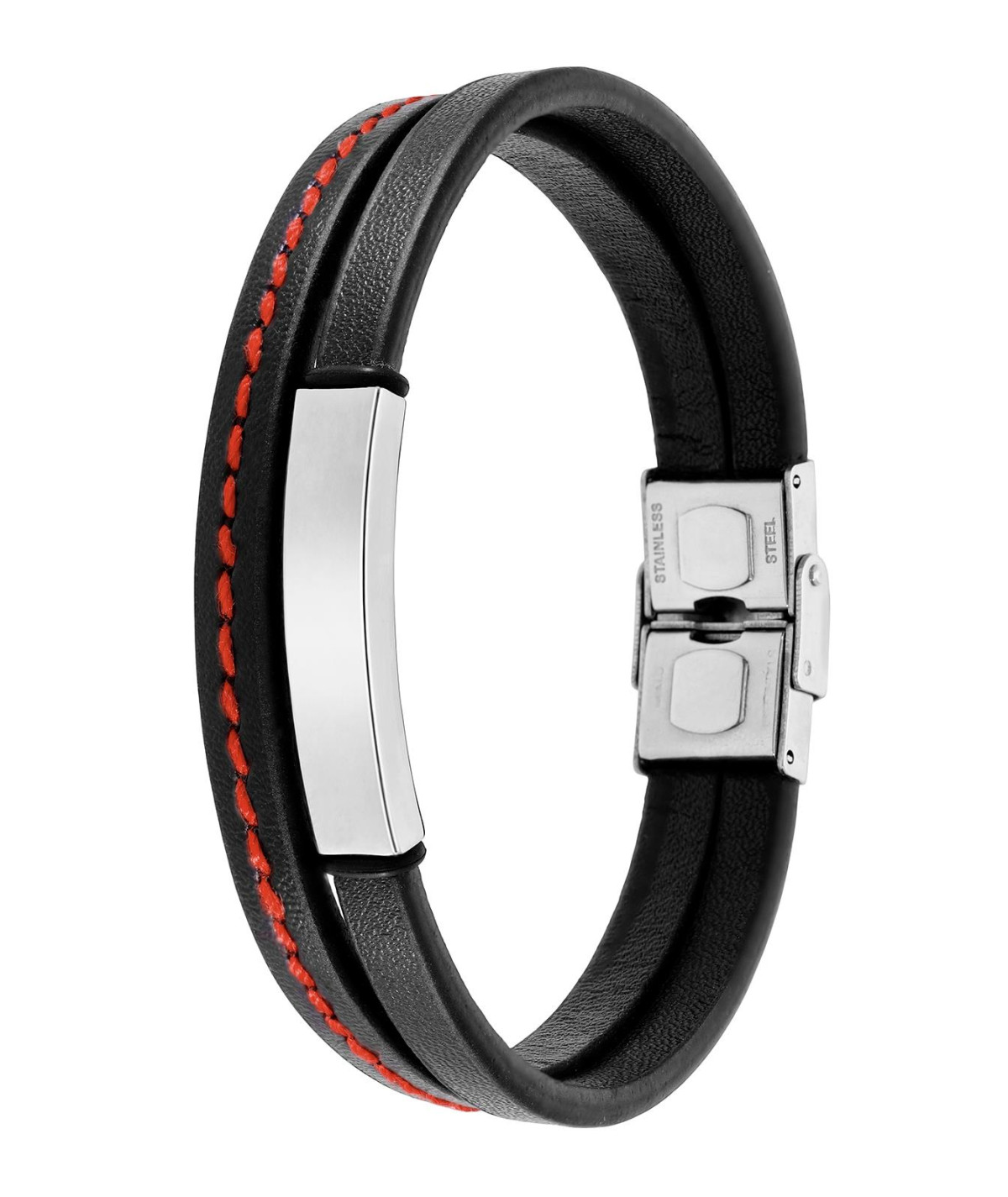 Pulsera para hombre, Especial Dia del Padre, en piel color negro con detalles hilo en color rojo y placa grabable