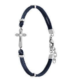 Pulsera para hombre, Especial Dia del Padre, de algodón azul con cruz de acero y componentes de acero.