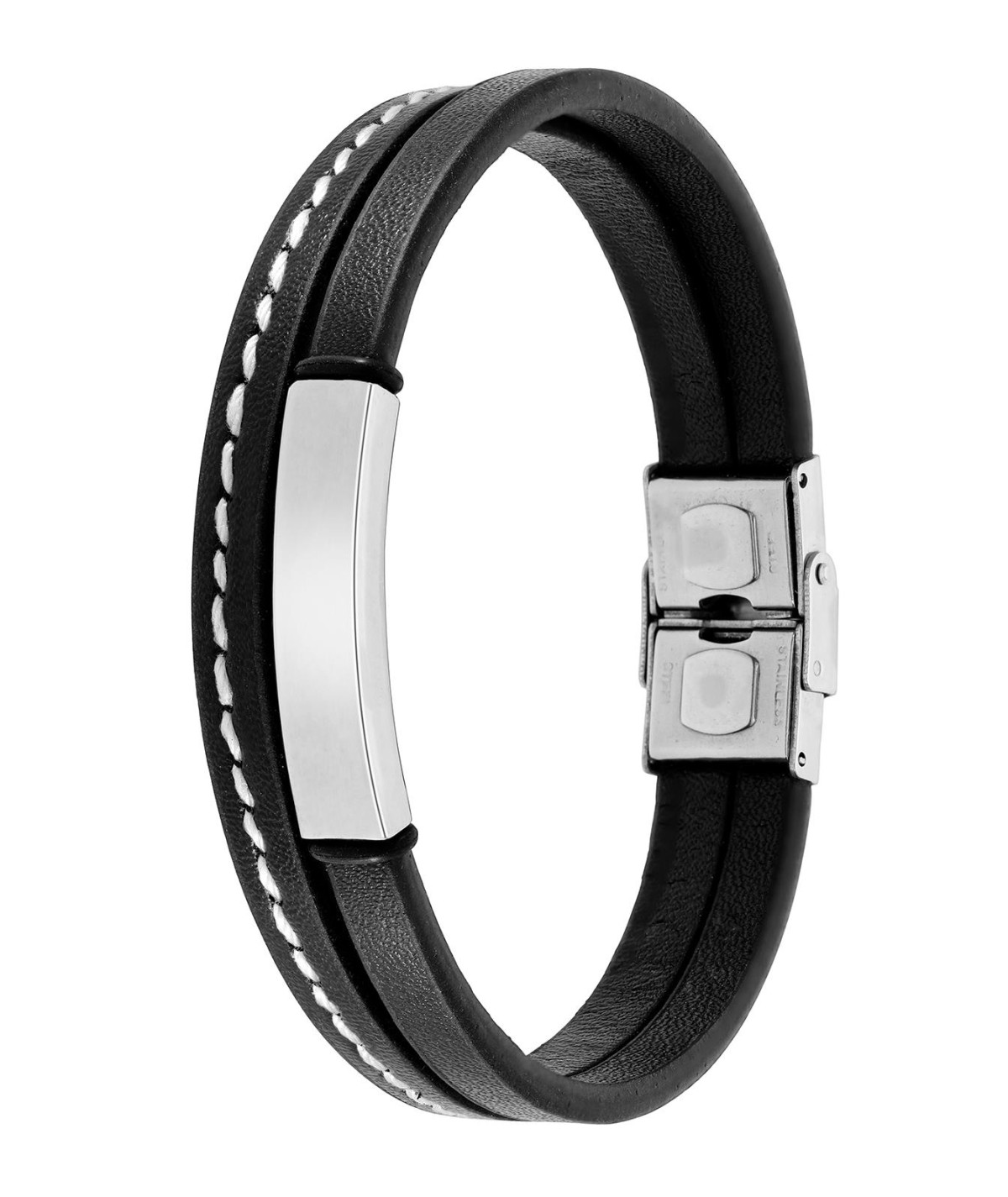 Pulsera para hombre, Especial Dia del Padre, de piel color negro con hilo en color blanco y pllaca grabable.