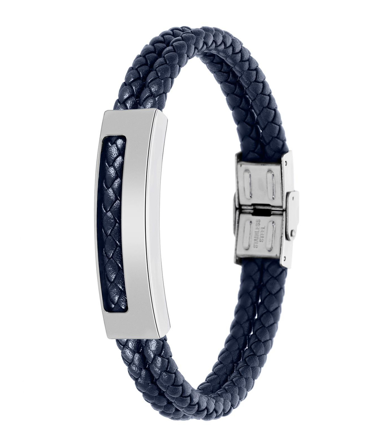 Pulsera para hombre, Especial Dia del Padre de cuero trenzado color azul marino y detalle central de placa en acero plateado