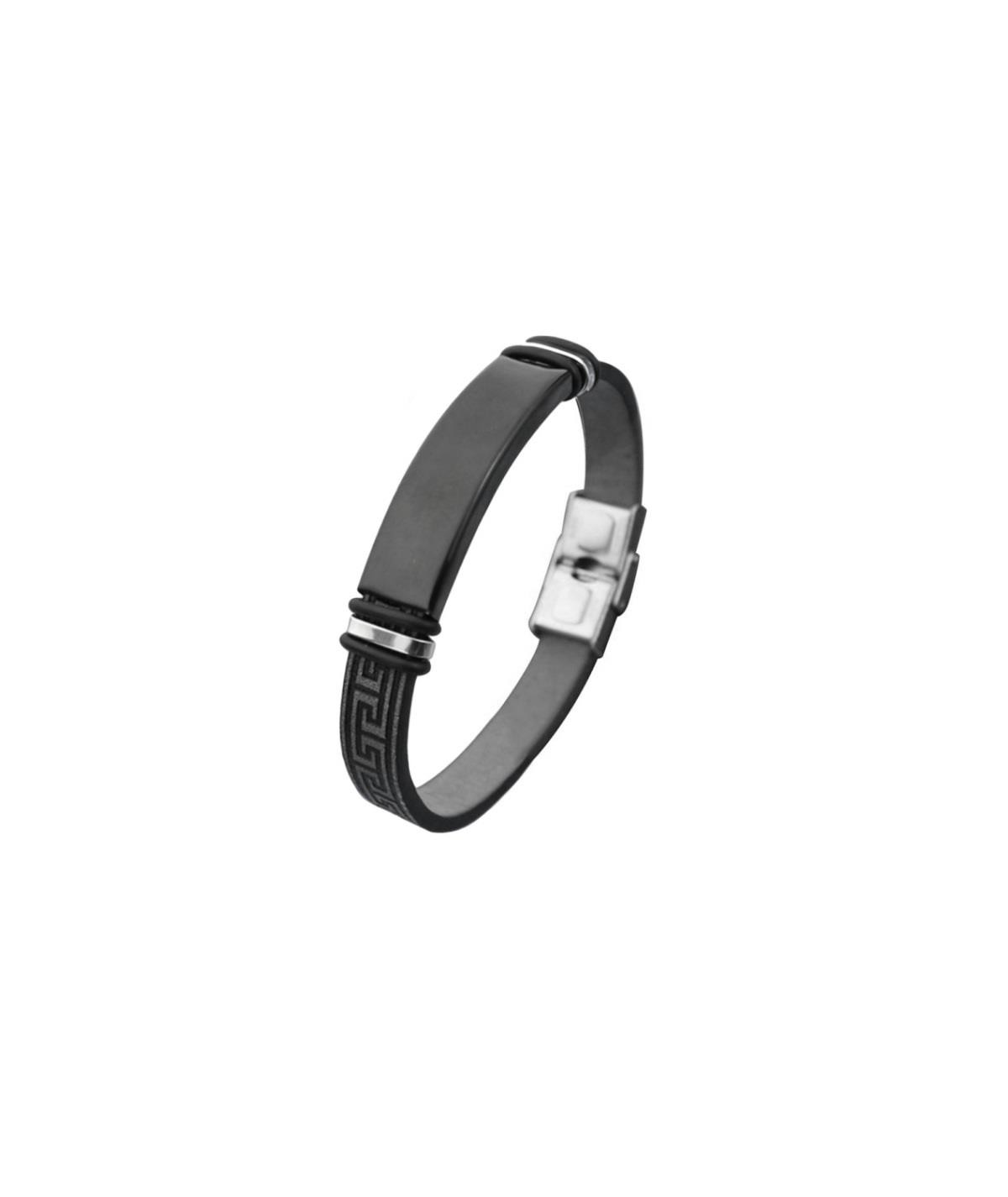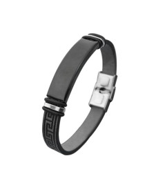 Pulsera para hombre, Especial dia del Padre de cuero negro con greca y placa central de acero color negro