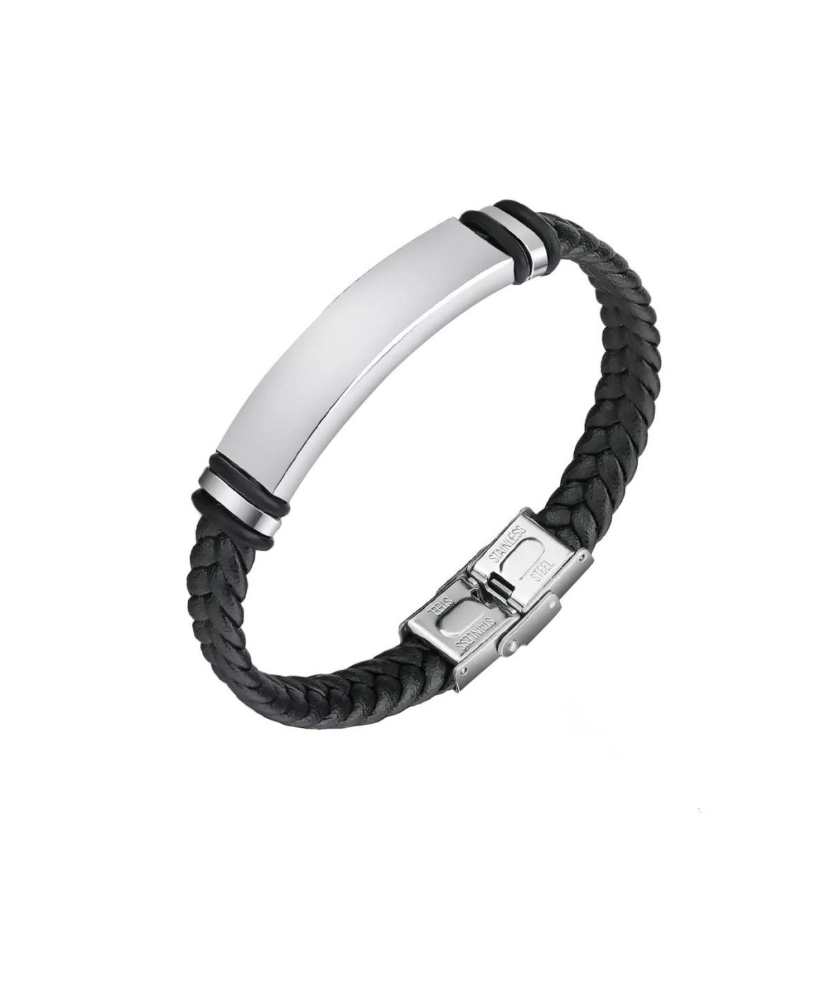 Pulsera para hombre, Especial dia del Padre de cuero trenzado color negro y placa central de acero