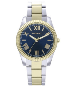 Reloj para mujer, analógico con caja de metal antialérgica color plata, bisel dorado y esfera azul con números romanos