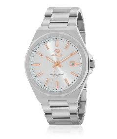 Reloj para hombre, analógico con caja de metal antialérgico color plata y esfera color plateado con índices y agujas en color cobre.