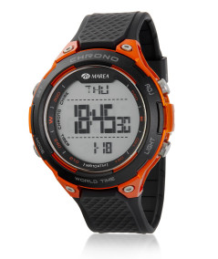 Reloj para hombre, digital con pantalla LCD y caja de resina color naranja con bisel negro y tapa trasera de acero.
