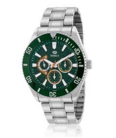 Reloj para hombre, analógico con caja de metal antialérgico color plata con con bisel verde, con tapa trasera y corona de acero.
