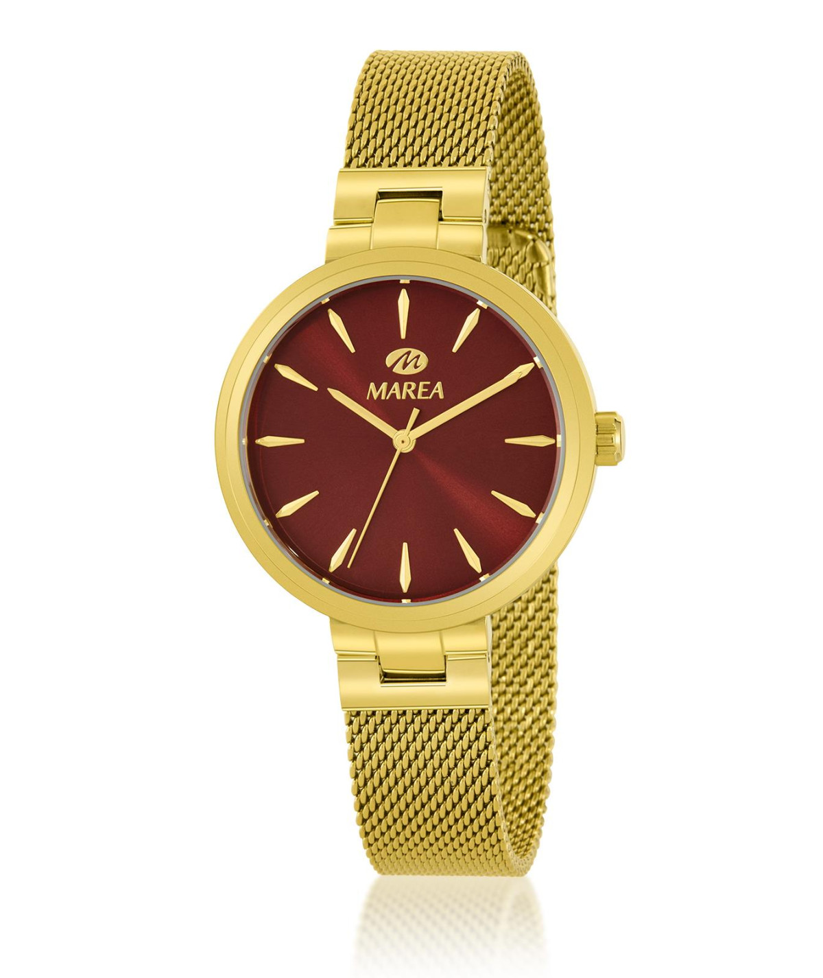 Reloj para mujer, analógico con caja de acero colo dorado y esfera granate con índices y agujas en color dorado